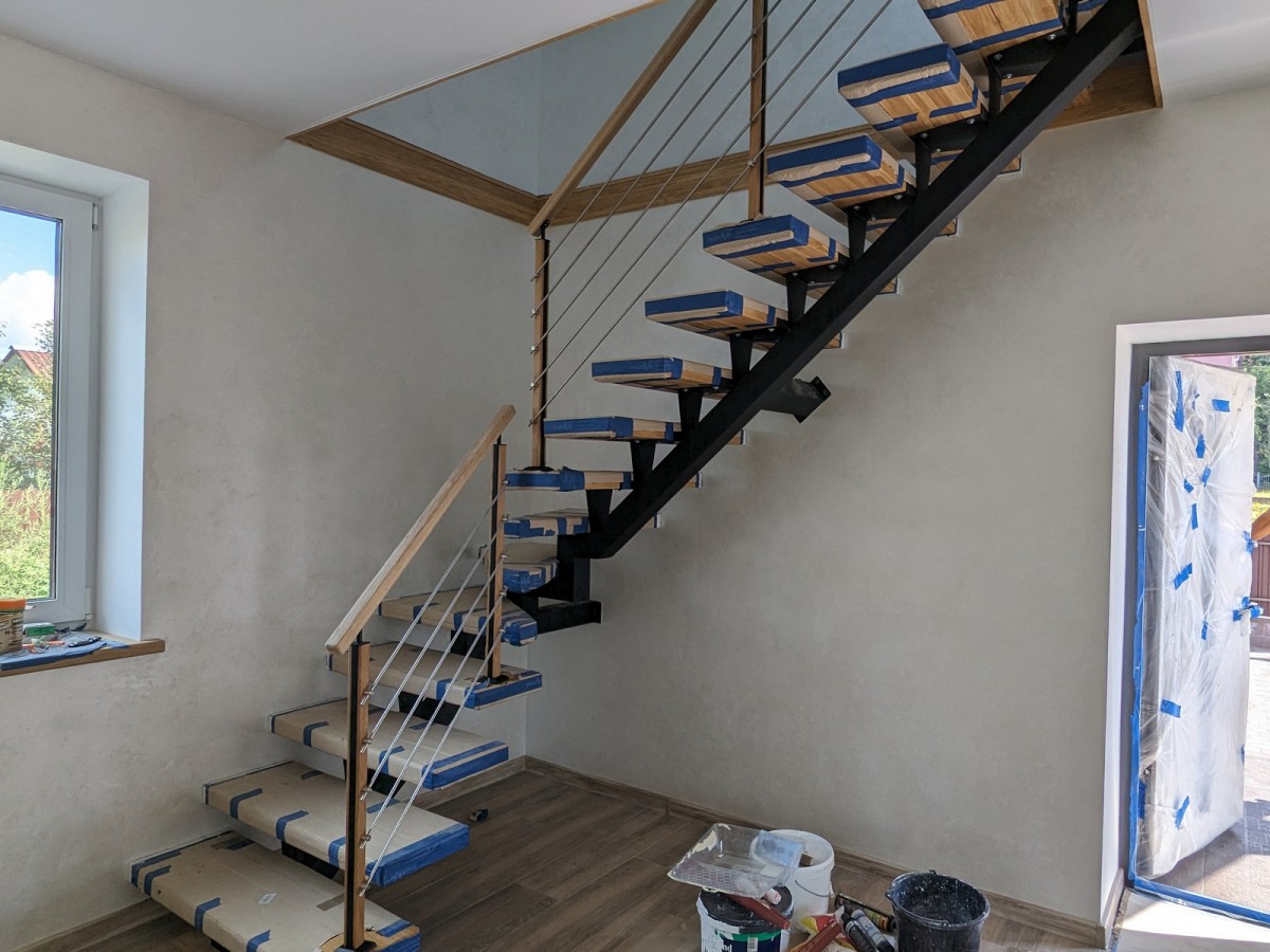 - Металлические стойки с деревянными поручнями создают контраст, который отлично вписывается в современные интерьеры.