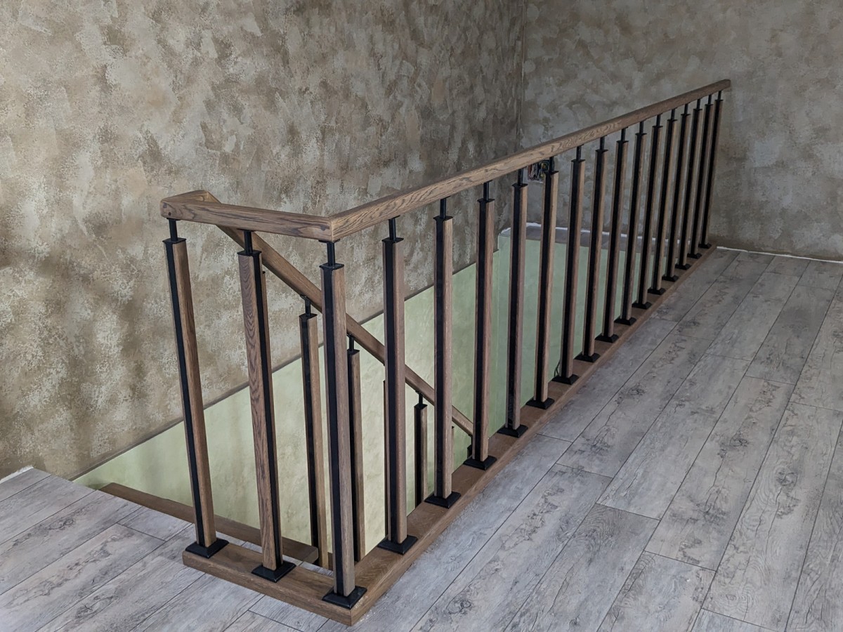 Стойки из окрашенного черного металла со вставками из разных пород дерева на выбор. Можно дополнить рейлингами или тросовым ограждением.