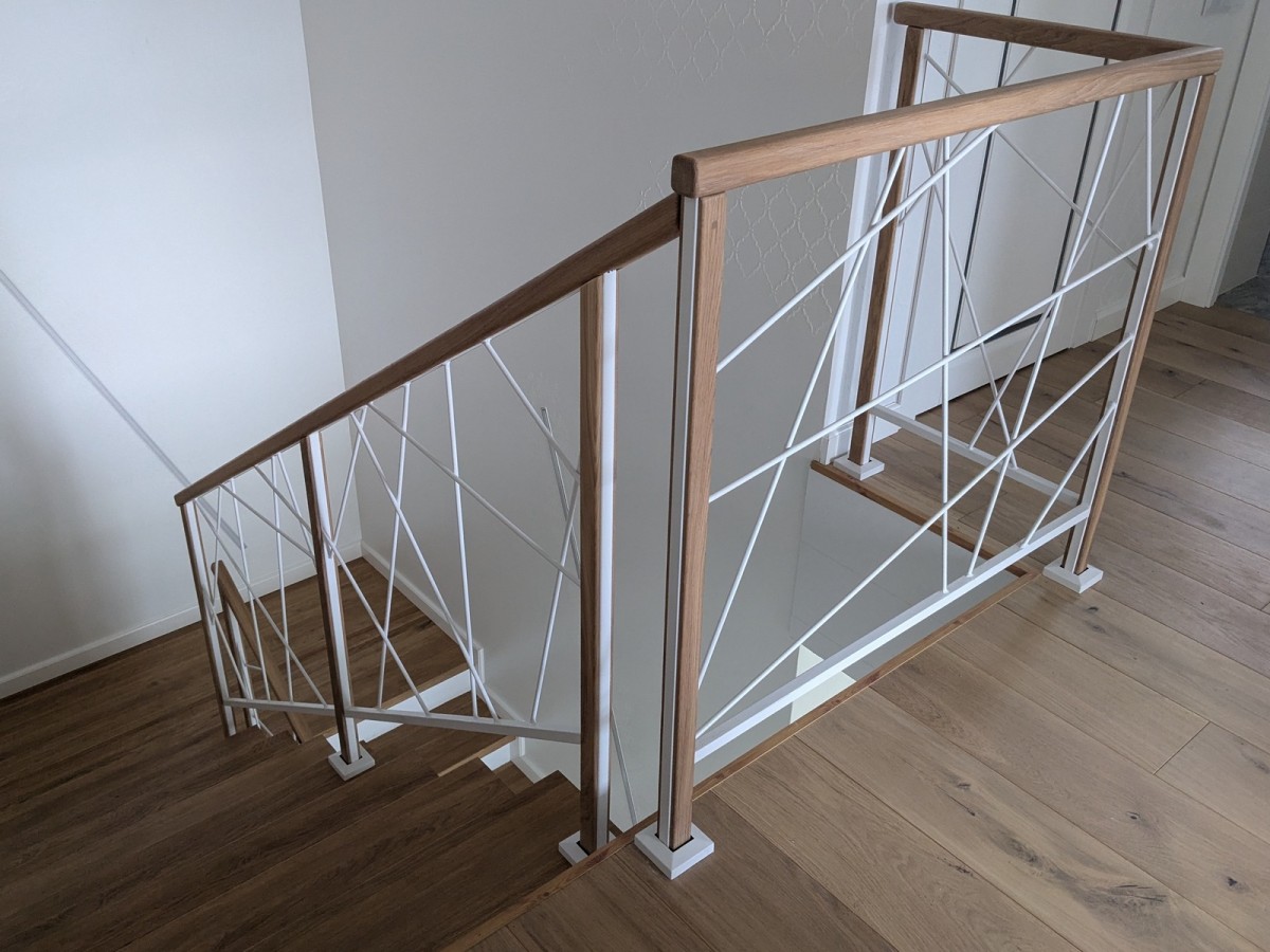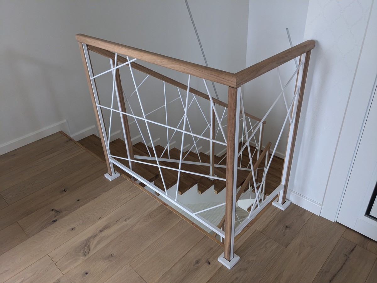 Металлическая основа дополняется поручнями из шлифованной, не тонированной древесины сорта АБ: натуральный оттенок и гладкая обработка подчёркивают графику «паутины» и делают хват тёплым и комфортным.