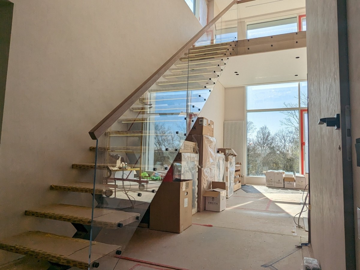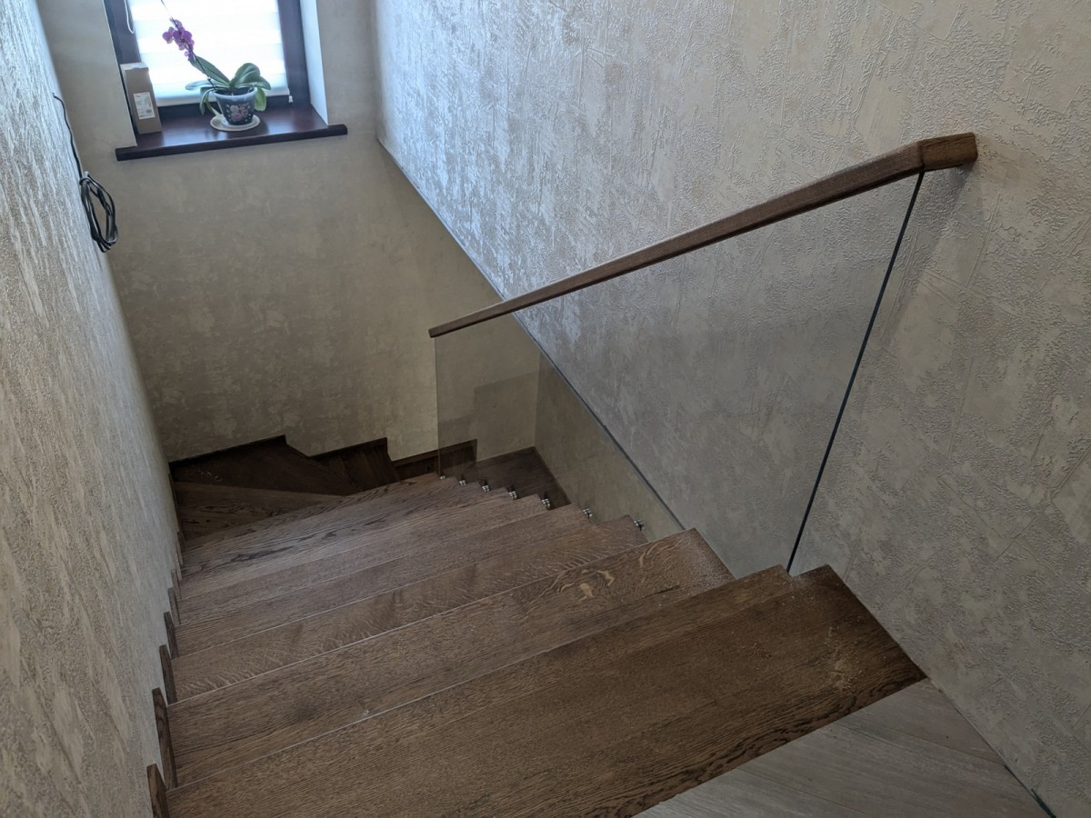 - Изготовление лестницы со ступенями из дуба и ограждением из осветленного стекла триплекс на ул. Нововиленская