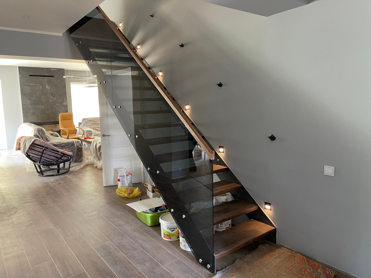 - Изготовление лестницы "Соло" со ступенями из березы и ограждением из стекла в Минске