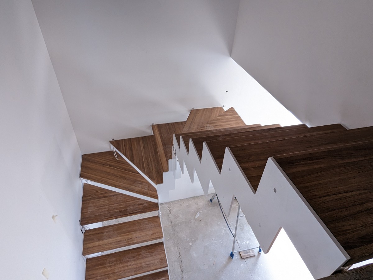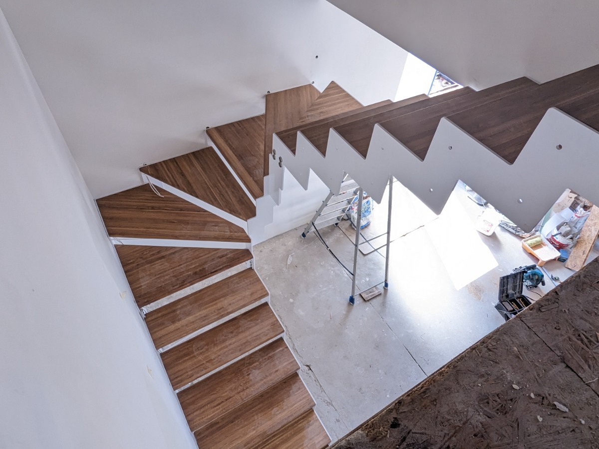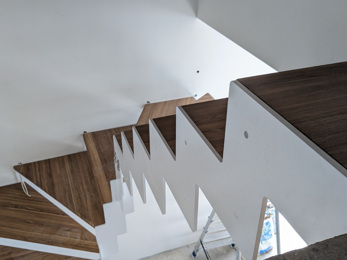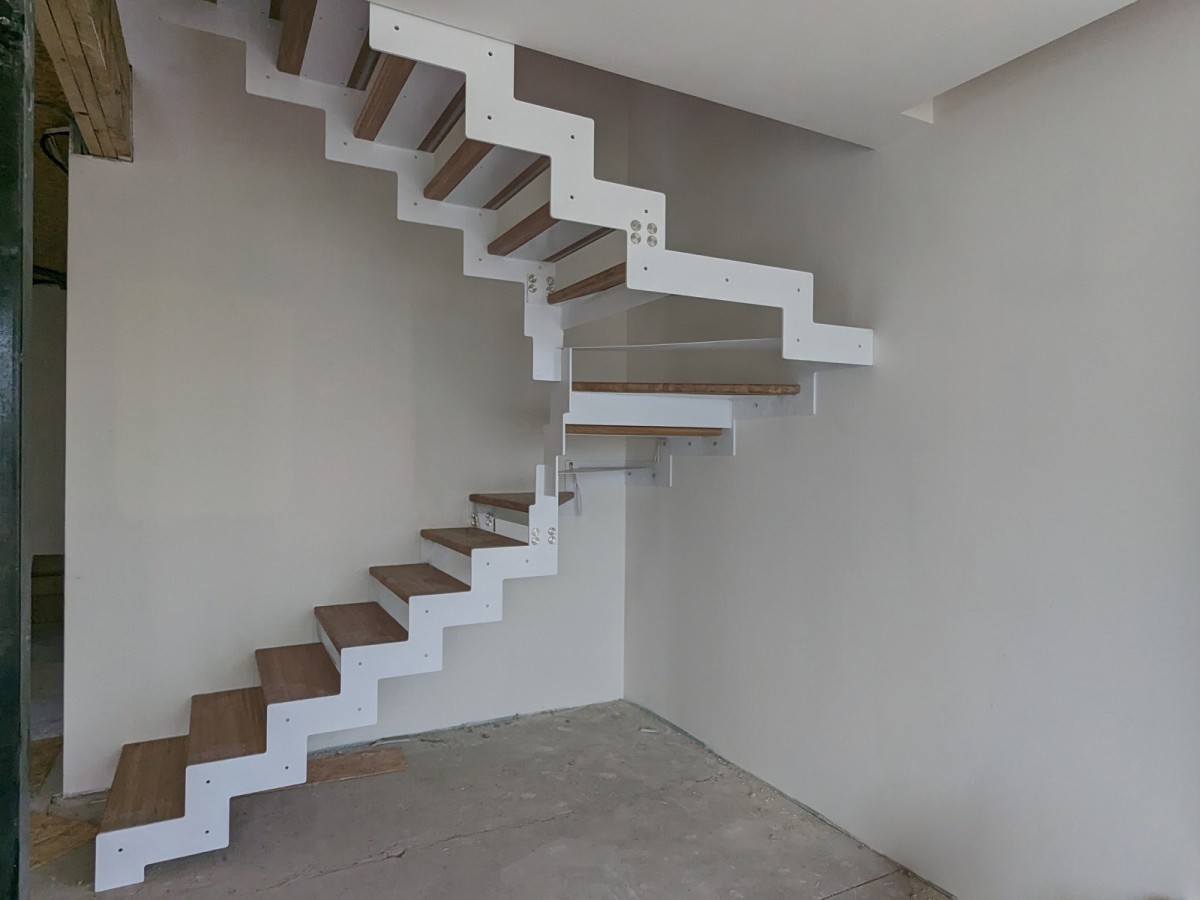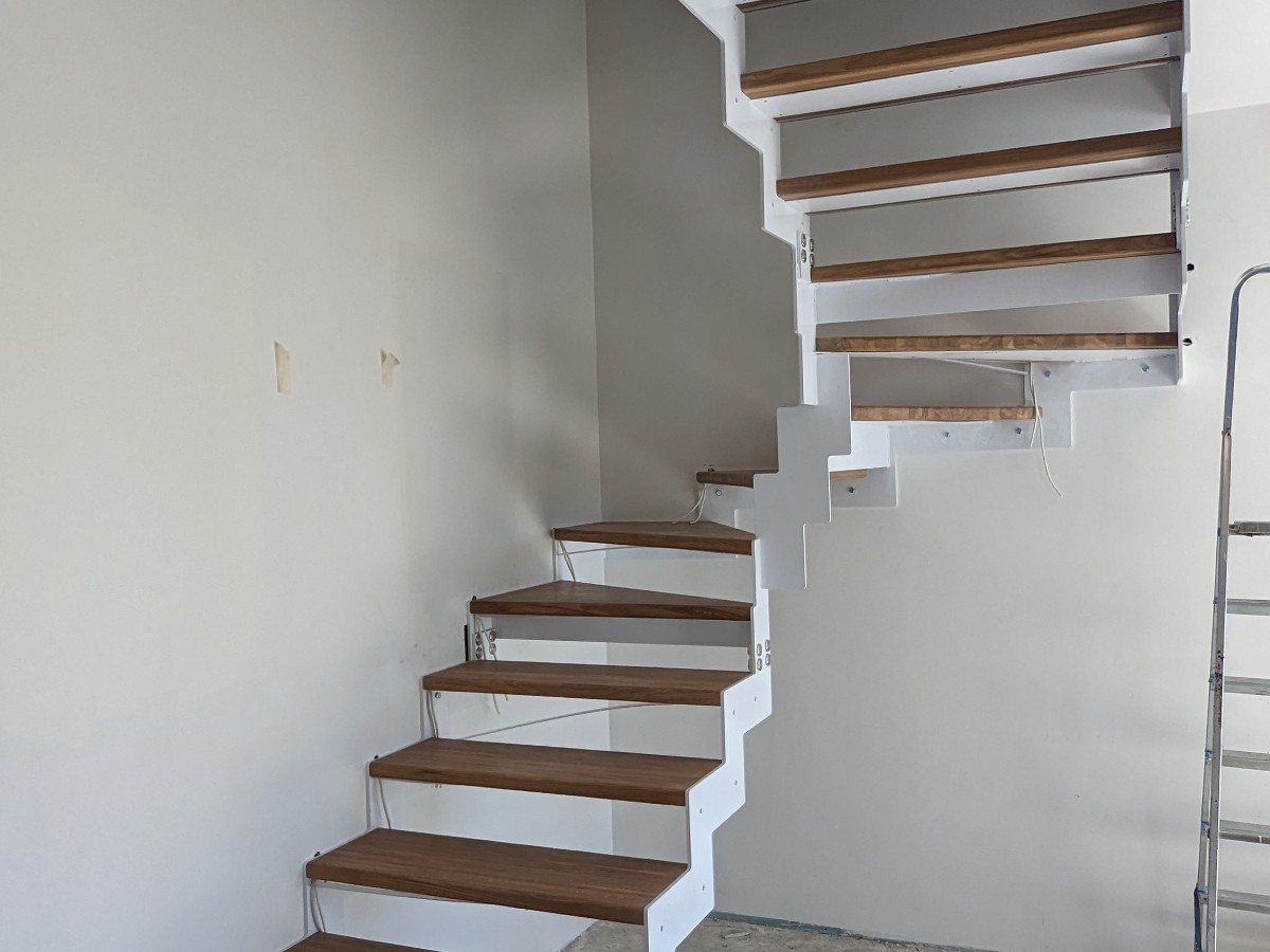 Изготовление лестницы "Эстет" с белым каркасом и ступенями из дуба в с.т. "На Птичи"