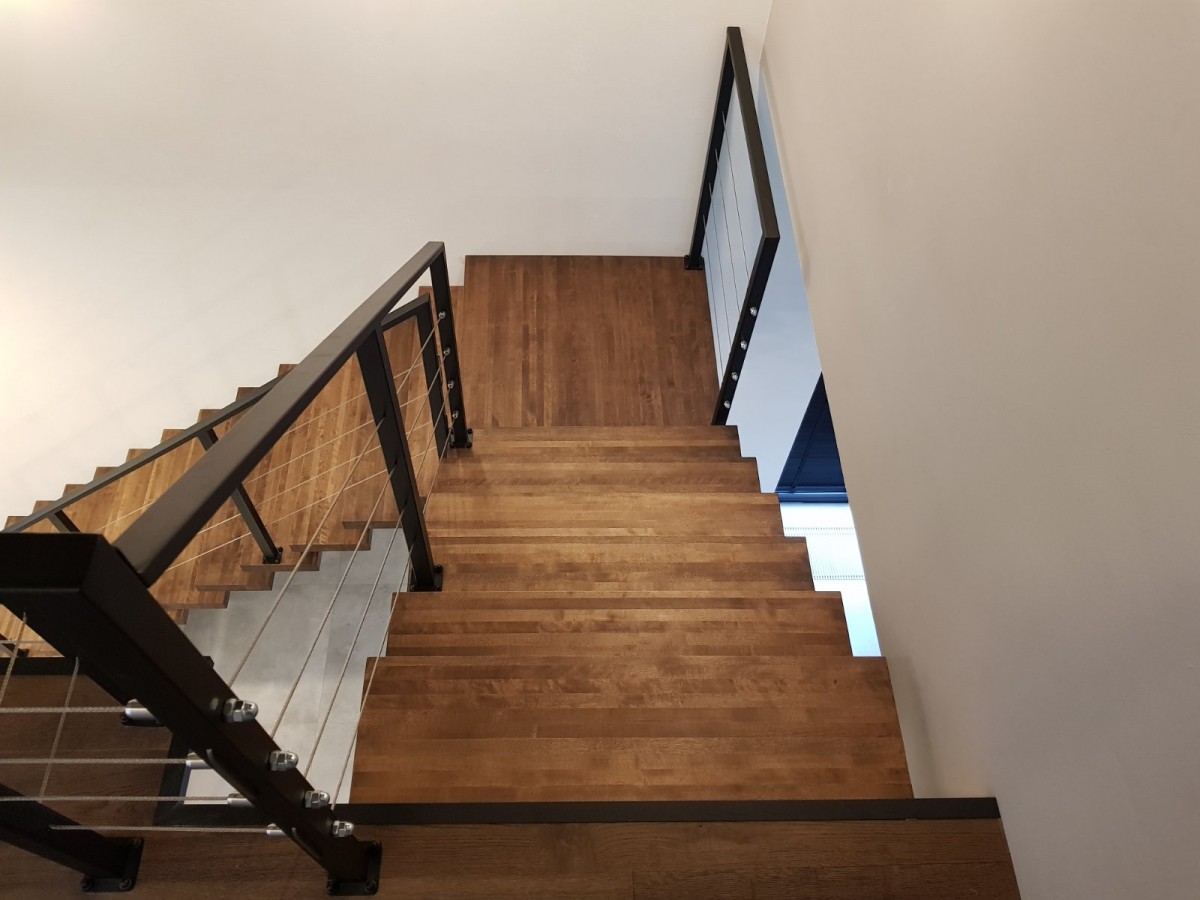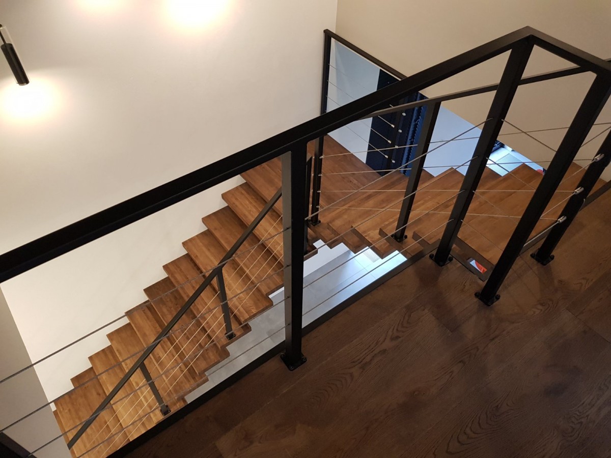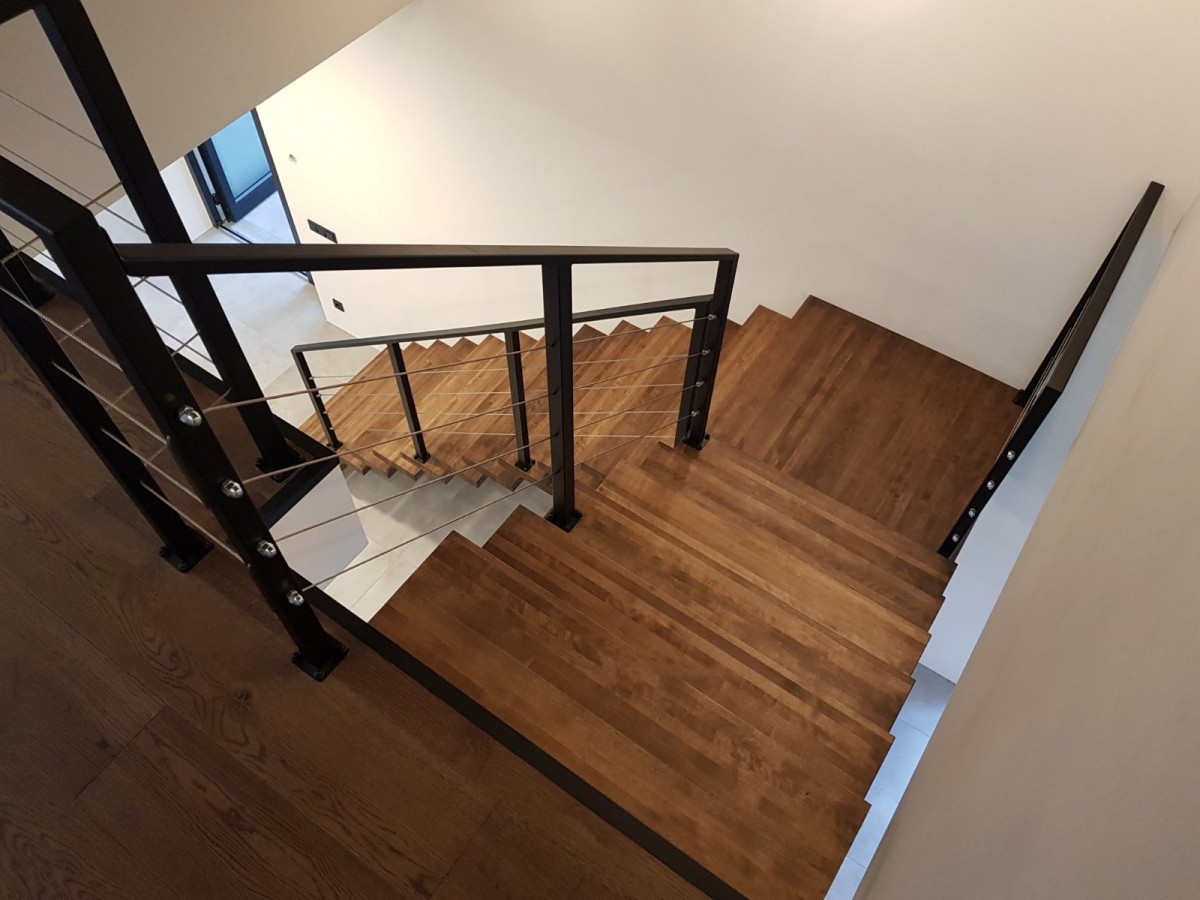 Данный проект был реализован в районе «Зелёная Гавань» в Минске. Клиент выбрал для своего дома вариант лестницы Соло на центральном косоуре в полимерном покрытии. Цельносварная лестница серии Соло — это очень надёжная и современная конструкция, которая отлично впишется в большинство стилей интерьера, даже если у вас дома царит эклектика. Отличительной особенностью проекта стали утолщённые берёзовые ступени 60 мм (в базовой комплектации идёт 40 мм.) и индивидуальное цельносварное ограждение с тросовым наполнением. Металлические элементы каркаса лестницы окрашены в благородный чёрный цвет, а ступени под маслом затонированы в тёмные цвета. Кстати, ступени лестницы и напольное покрытие второго этажа почти не отличаются по оттенку, что создает ощущение неразрывности пространства. В целом, можно сказать, что лестница выполнена в трендовом стиле «Лофт» и удачно аккомпанирует общему стилю жилого пространства.
