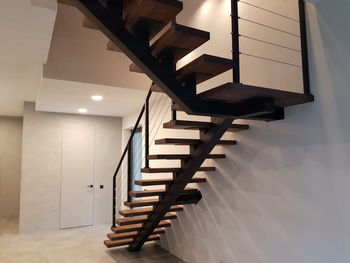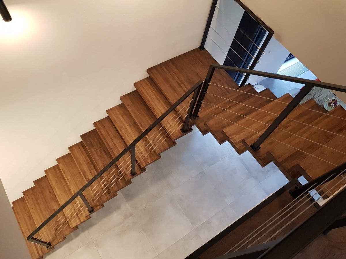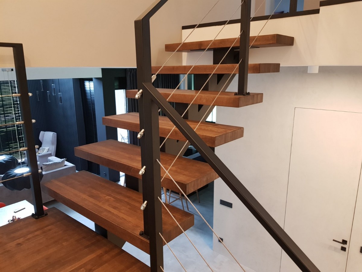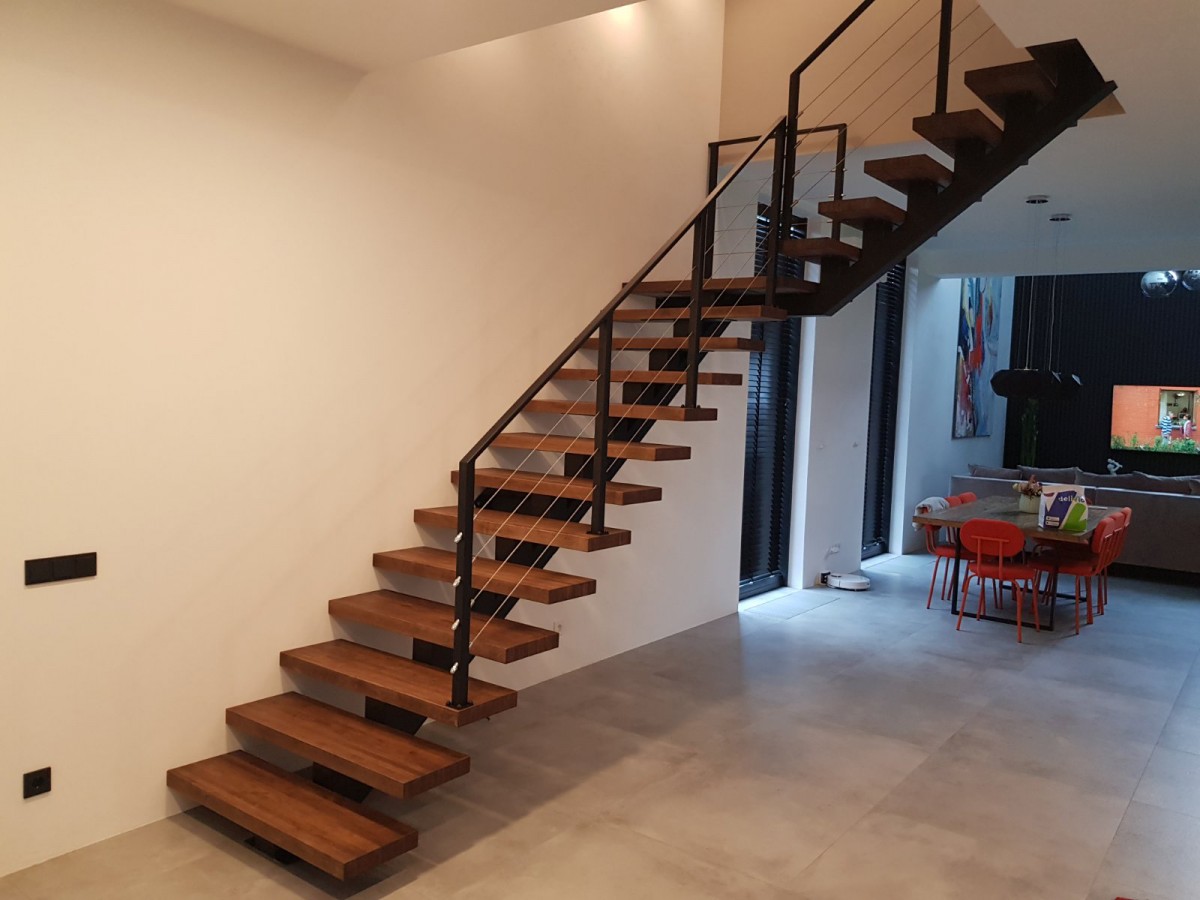 Данный проект был реализован в районе «Зелёная Гавань» в Минске. Клиент выбрал для своего дома вариант лестницы Соло на центральном косоуре в полимерном покрытии. Цельносварная лестница серии Соло — это очень надёжная и современная конструкция, которая отлично впишется в большинство стилей интерьера, даже если у вас дома царит эклектика. Отличительной особенностью проекта стали утолщённые берёзовые ступени 60 мм (в базовой комплектации идёт 40 мм.) и индивидуальное цельносварное ограждение с тросовым наполнением. Металлические элементы каркаса лестницы окрашены в благородный чёрный цвет, а ступени под маслом затонированы в тёмные цвета. Кстати, ступени лестницы и напольное покрытие второго этажа почти не отличаются по оттенку, что создает ощущение неразрывности пространства. В целом, можно сказать, что лестница выполнена в трендовом стиле «Лофт» и удачно аккомпанирует общему стилю жилого пространства.