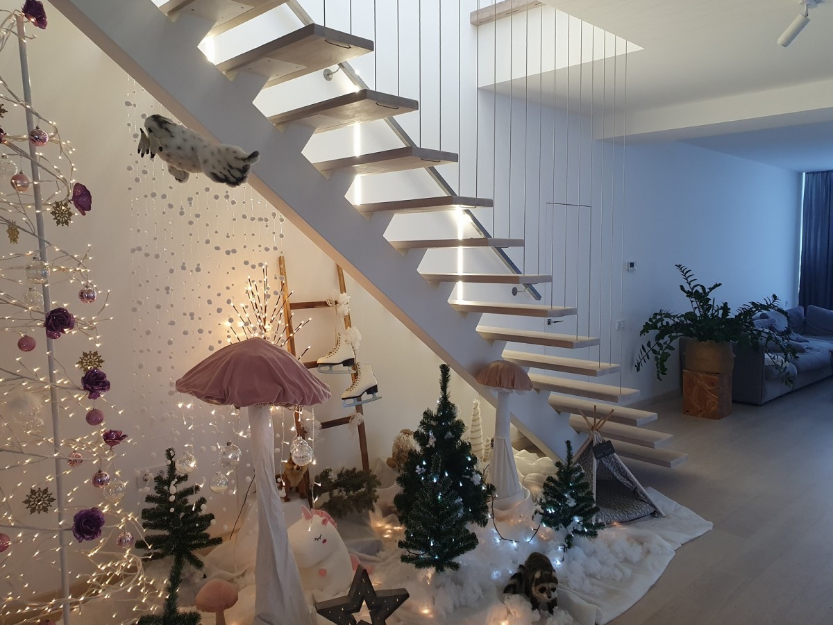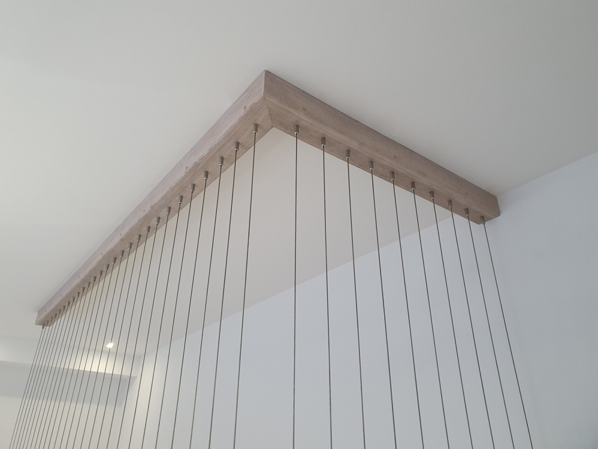 Имеем: большой проем с существующей лестницей заказчика (дубовые ступенями под маслом и цельносварной каркас, аналог нашего Соло). А еще чистовые подвесные потолки с неизвестным креплением и стремление заказчика к необычному решению. И вот итог.