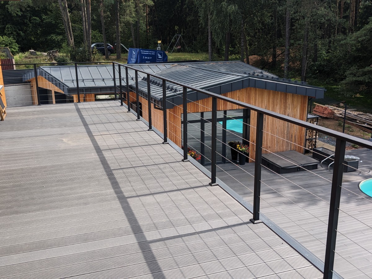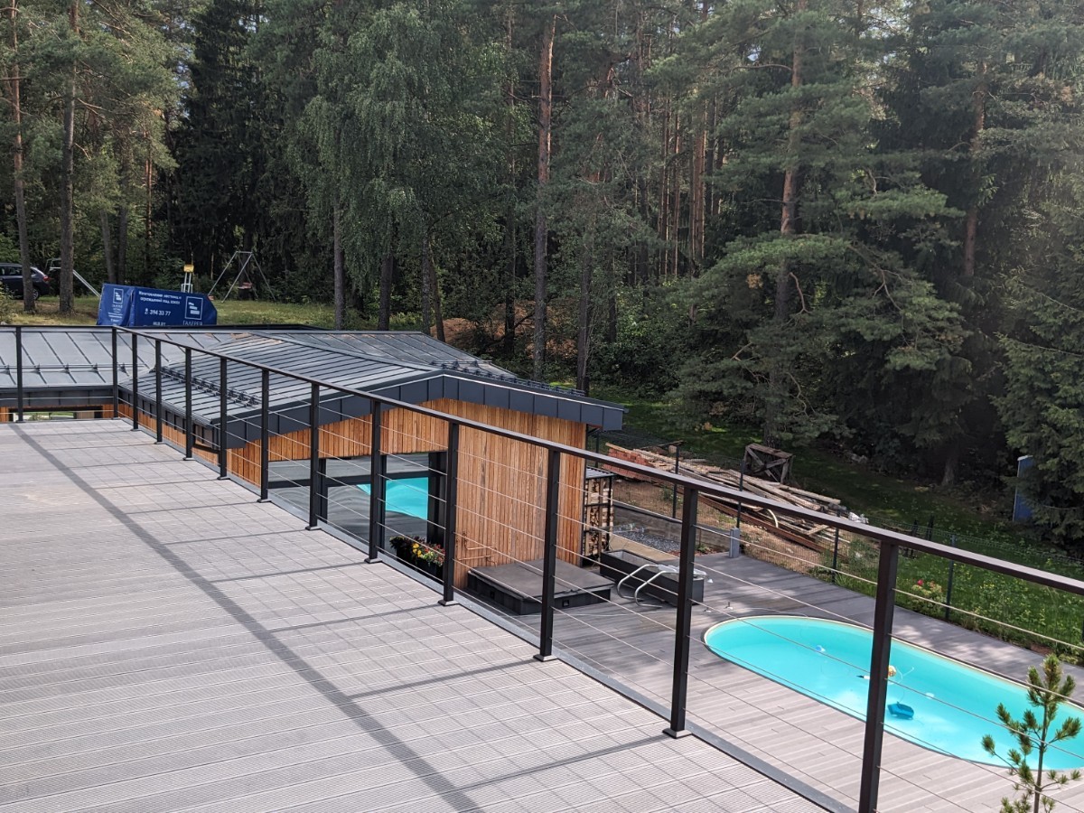 - Для достижения легкости и визуальной прозрачности было выбрано тросовое ограждение. Оно позволяет наслаждаться живописными видами и одновременно создает защитный барьер.