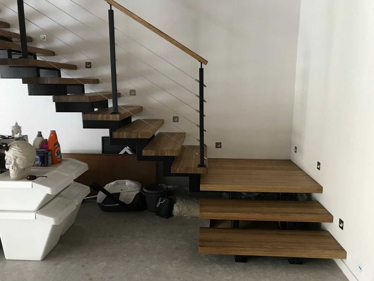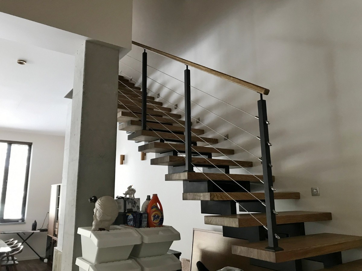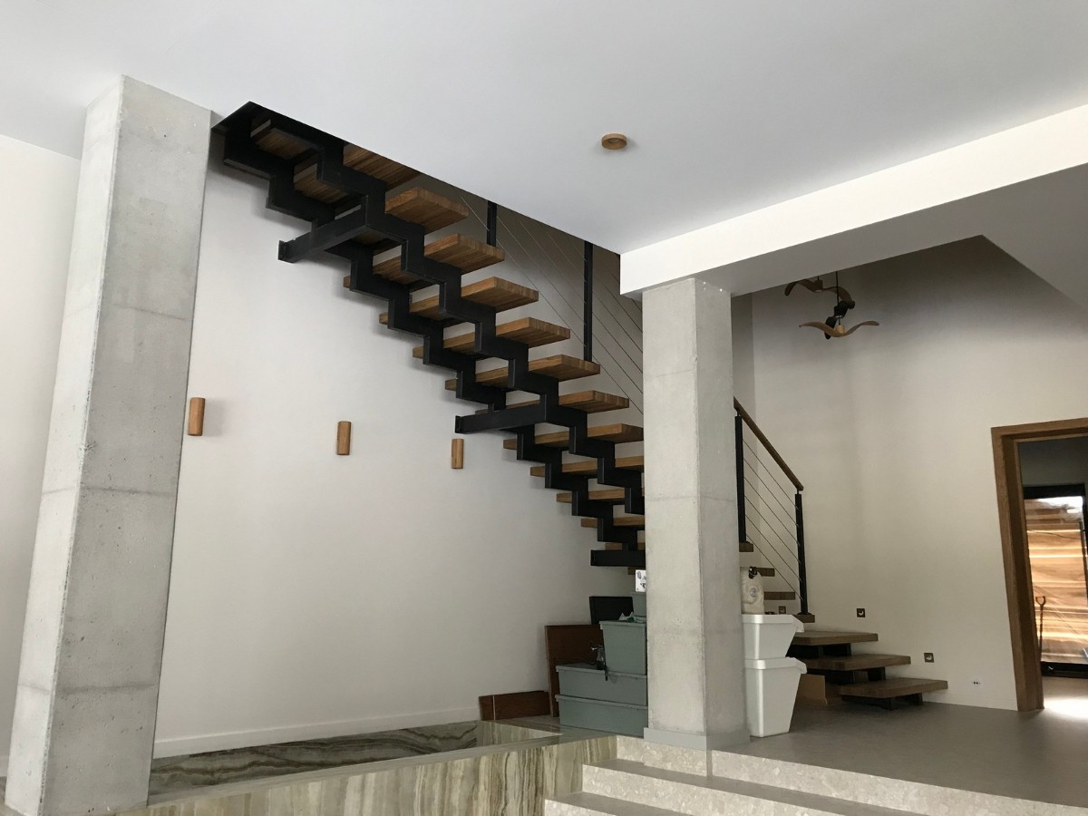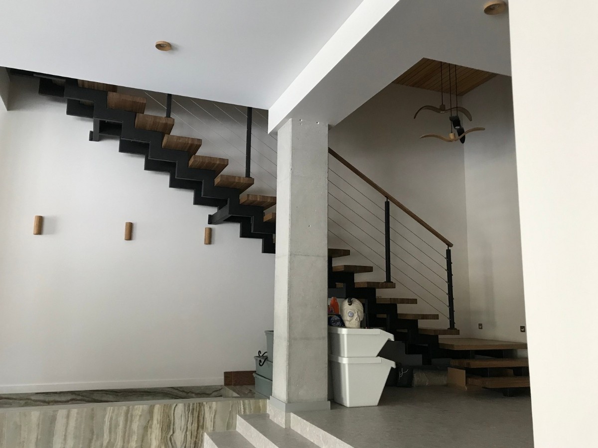 В этом проекте мы выполнили монтаж лестницы «Гарант» на двух косоурах в современном интерьере с открытым пространством и высоким световым проёмом. Конструкция получилась визуально лёгкой за счёт открытых ступеней, но при этом выглядит основательно благодаря массивным дубовым проступям толщиной 60 мм.