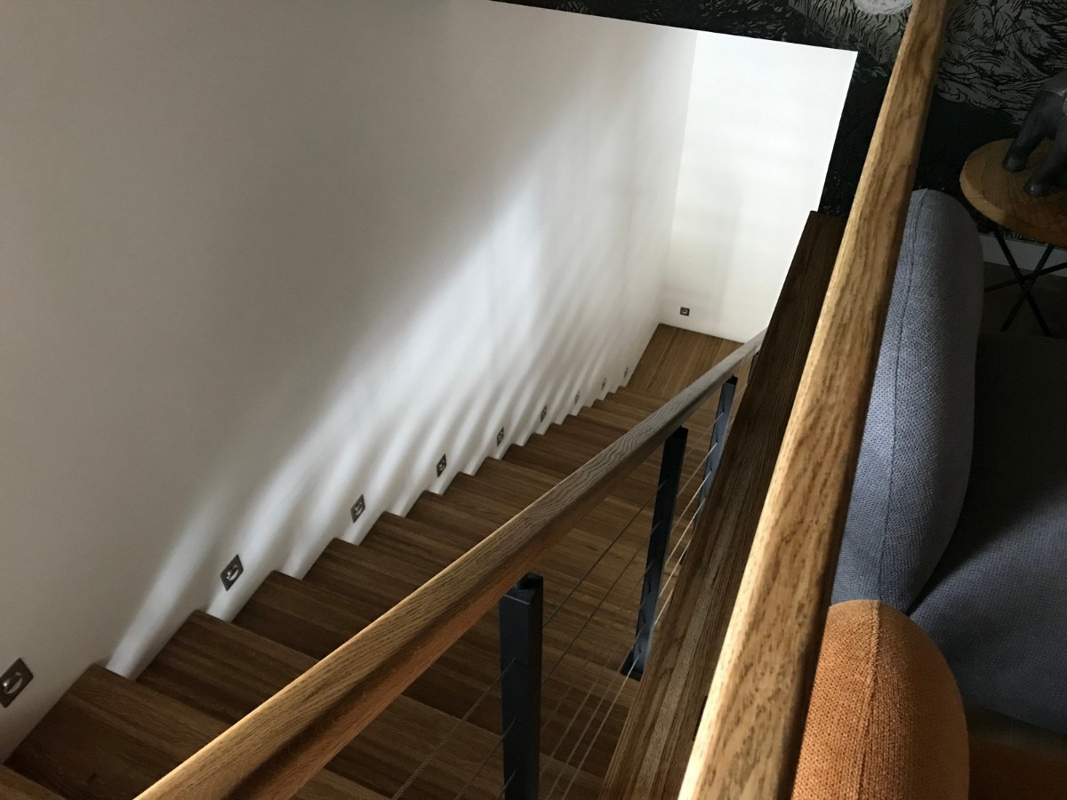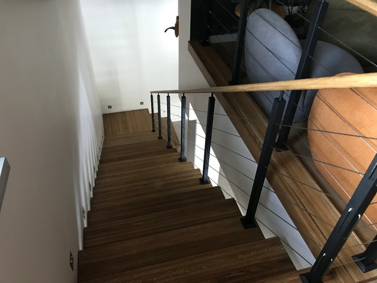 Отдельное внимание уделили ограждению: тросовая система хорошо подходит для современных домов, где важно сохранить ощущение пространства. При этом деревянный поручень делает контакт рукой приятным и логично связывает ограждение со ступенями из дуба.