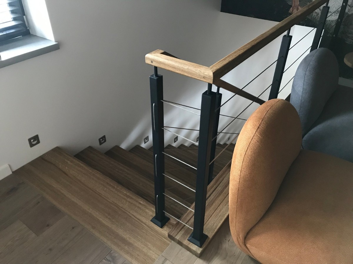 | Ограждение | Тросовое ограждение с деревянным поручнем | Минимум визуального веса, больше света и «воздуха» в зоне лестницы |