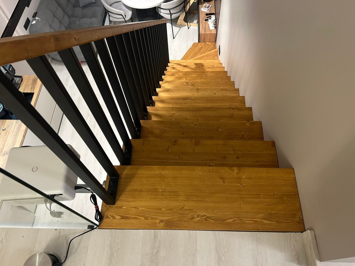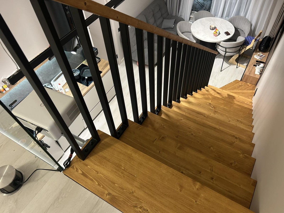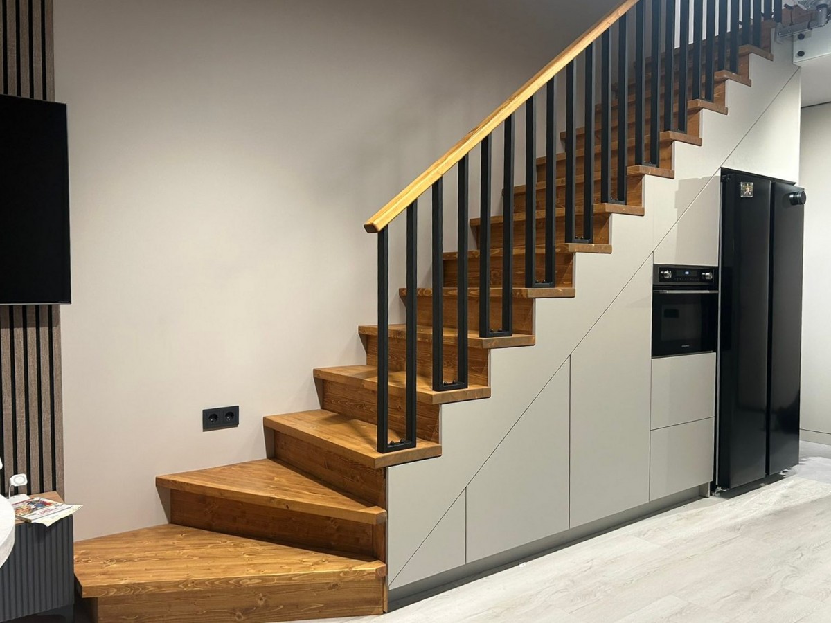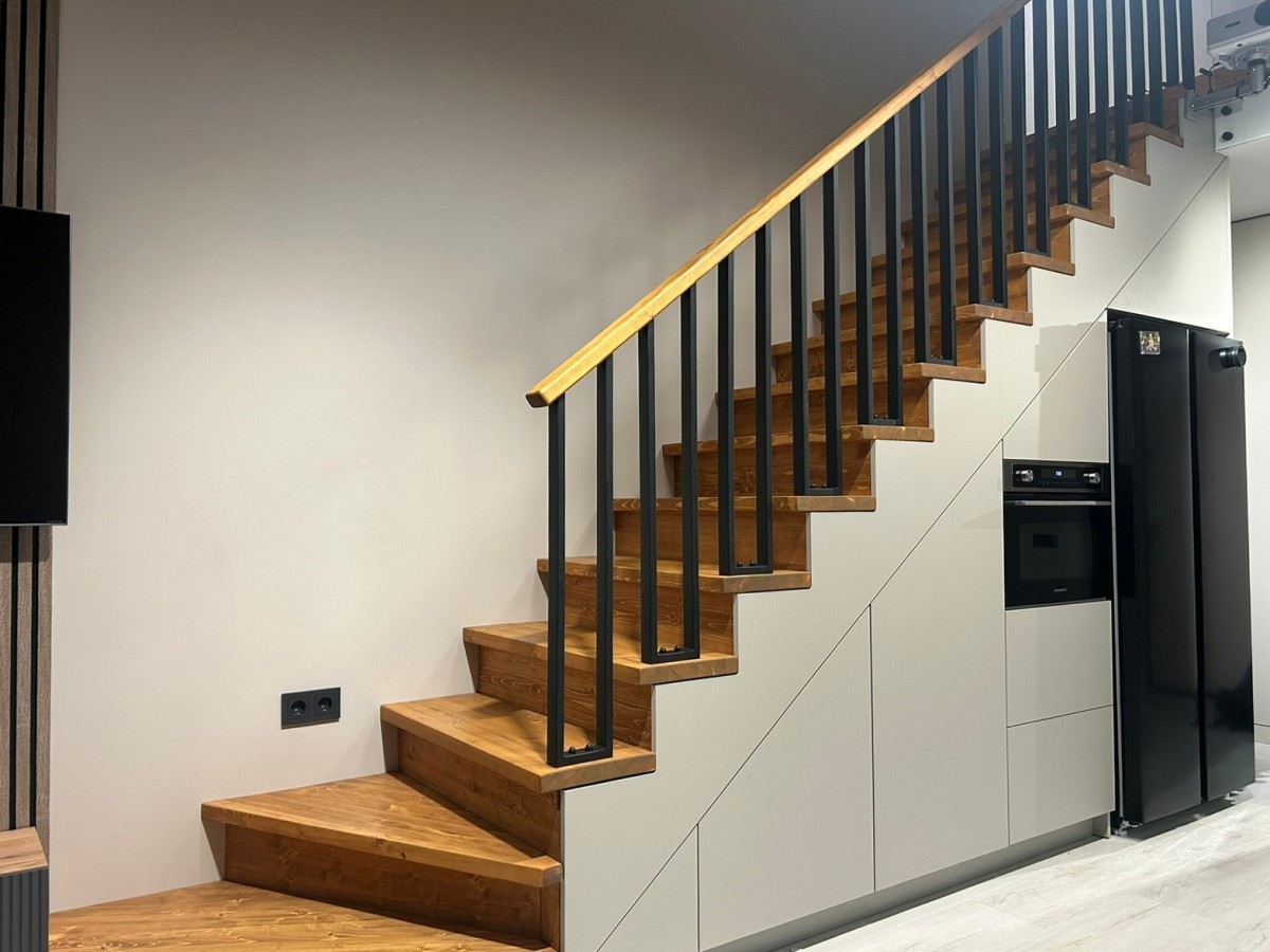 - Функциональность: лестница оптимально вписана в пространство квартиры, эффективно соединяя два уровня без потери полезной площади;