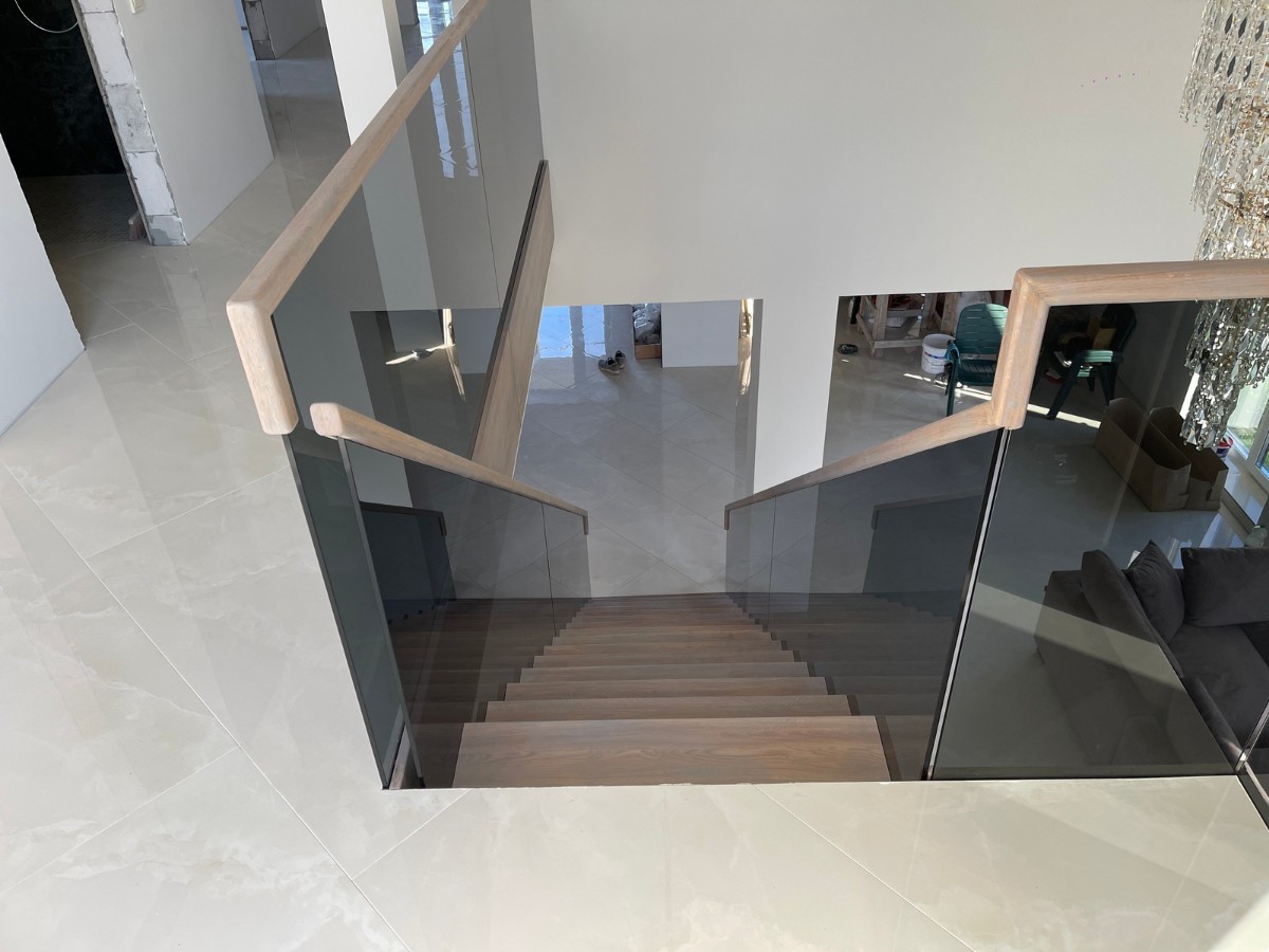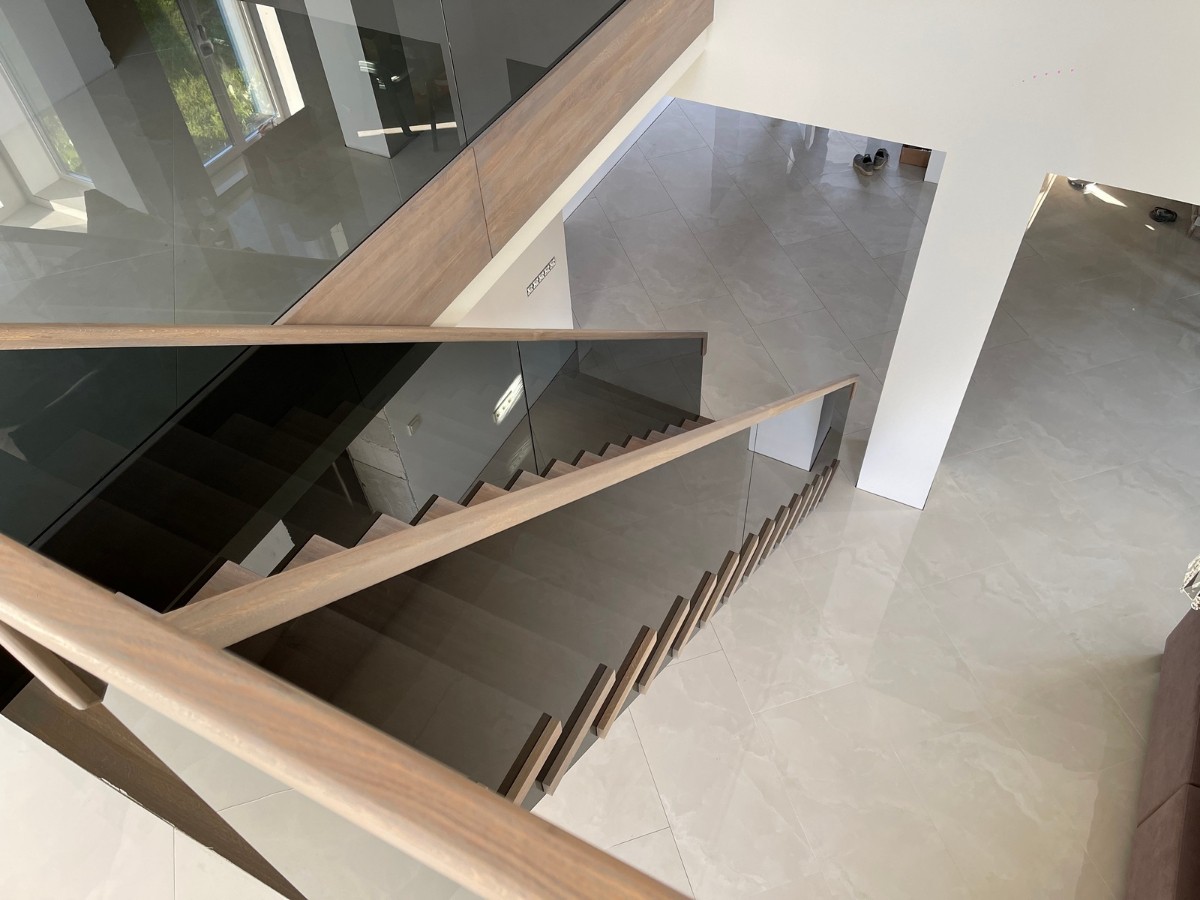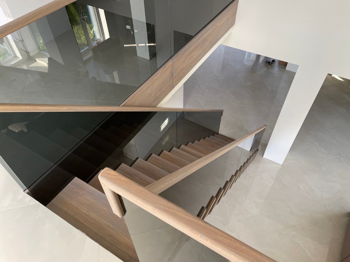 - Поручень: дуб, прямоугольный со скруглёнными кромками; стыки в поворотах под 45°, скрытое крепление через стекло/кронштейны.