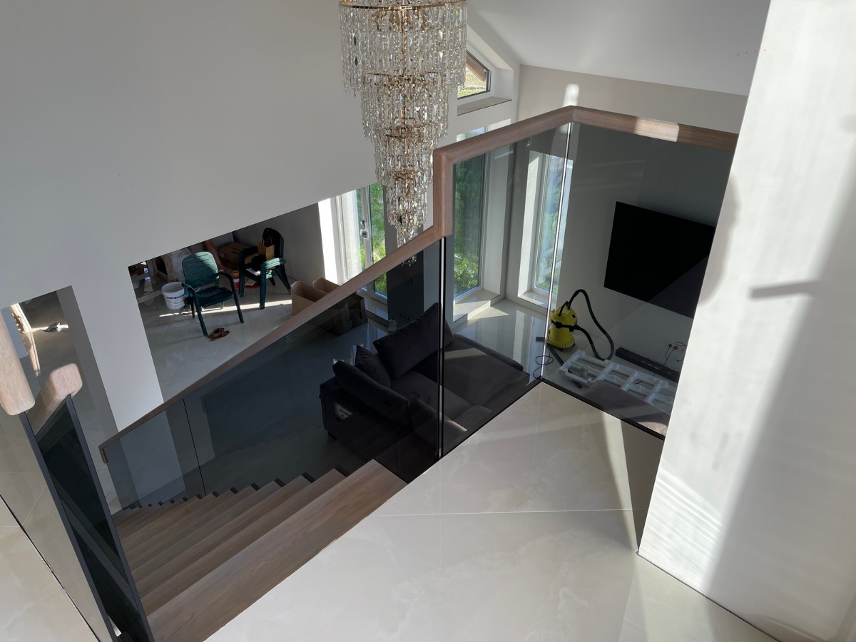 Установка лестницы серии Дуэт с дубовыми ступенями 60 мм и стеклянным ограждением в Жодино