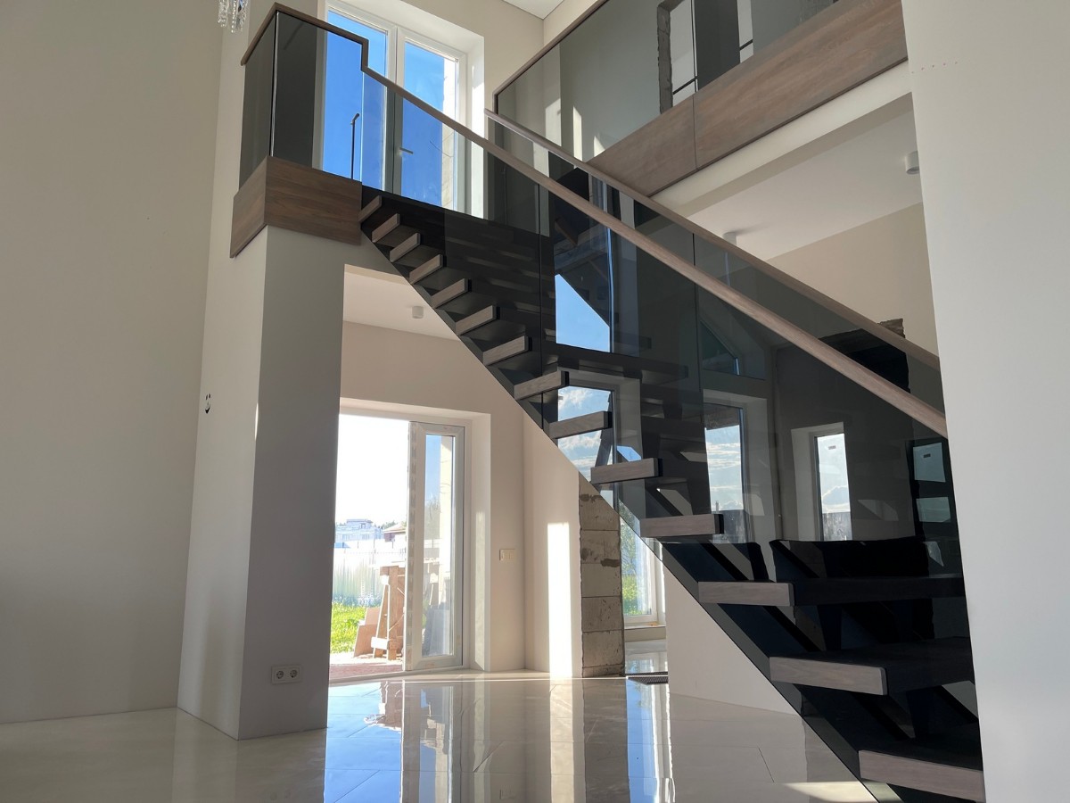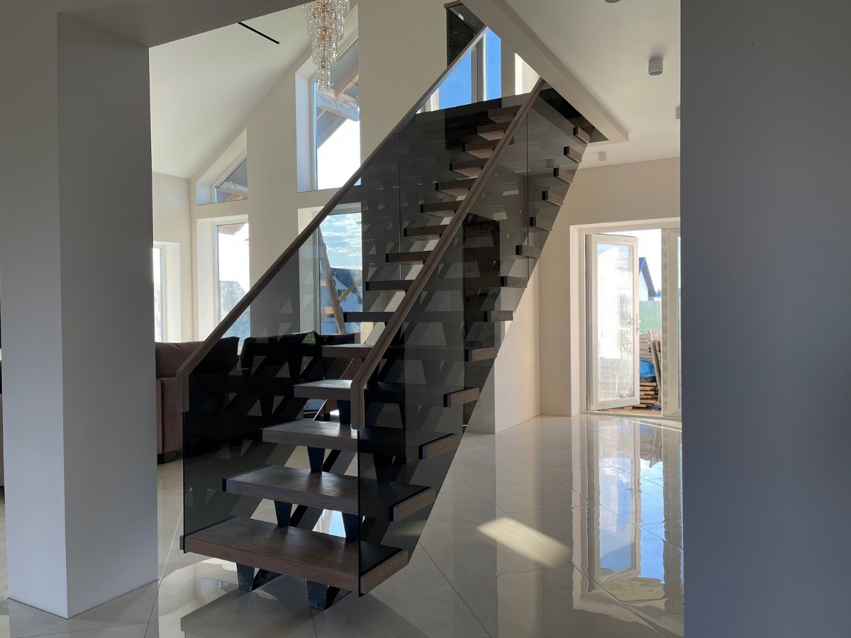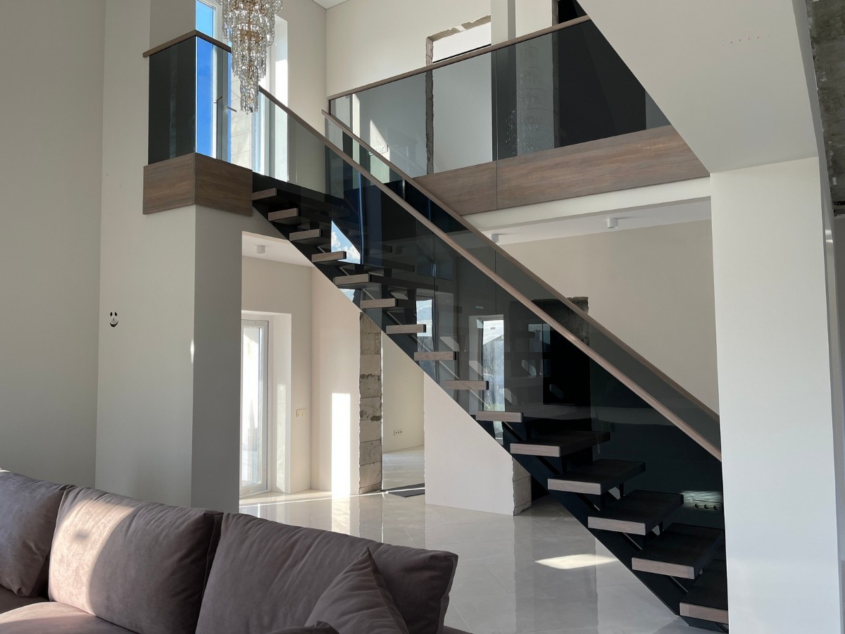 Задача: вписать лестницу в минималистичный интерьер, сохранить воздушность и сквозные виды, обеспечить безопасный выход на антресоль/второй уровень.