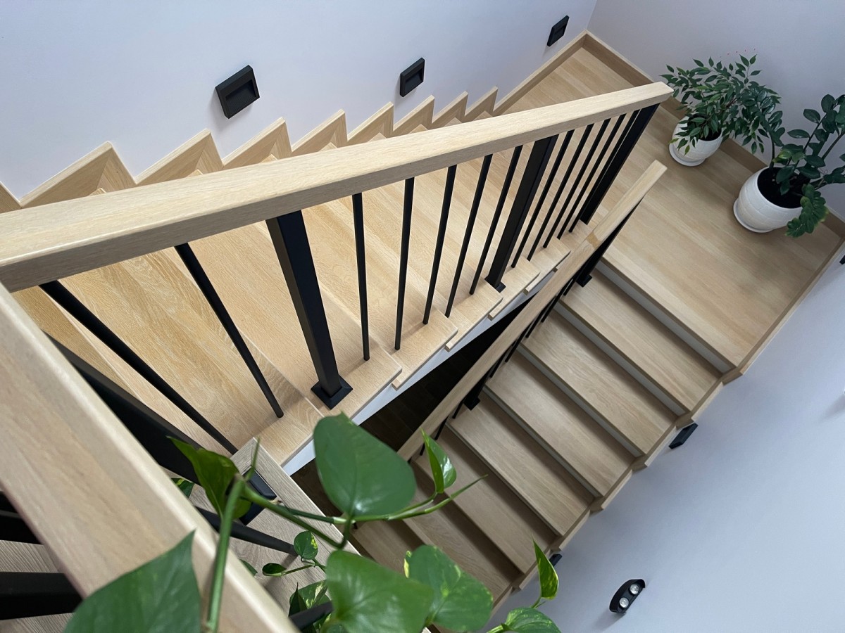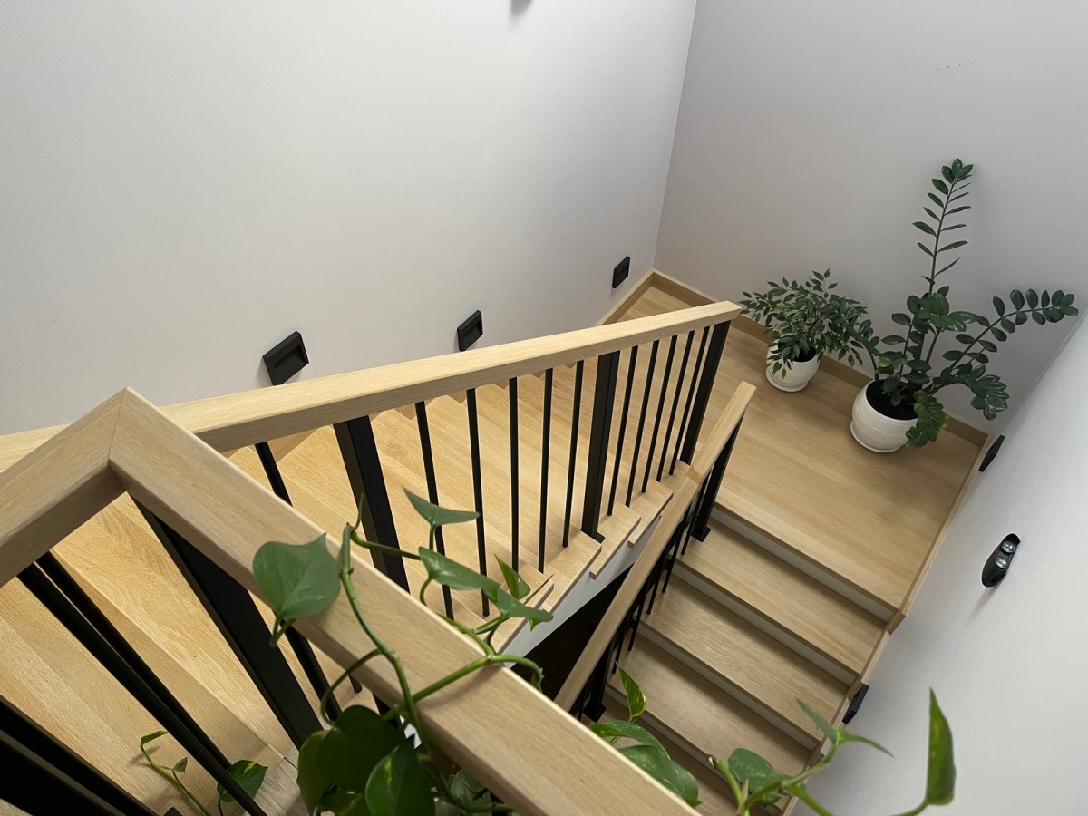 Установлено ограждение модели «Вертикаль»: стальные стойки и вертикальные балясины с порошковым окрасом в чёрный мат, дополненные поручнем из шлифованного дуба без тонировки. Геометрия выдержана по всей линии — от марша к площадке и обратно, с аккуратным угловым узлом поручня.