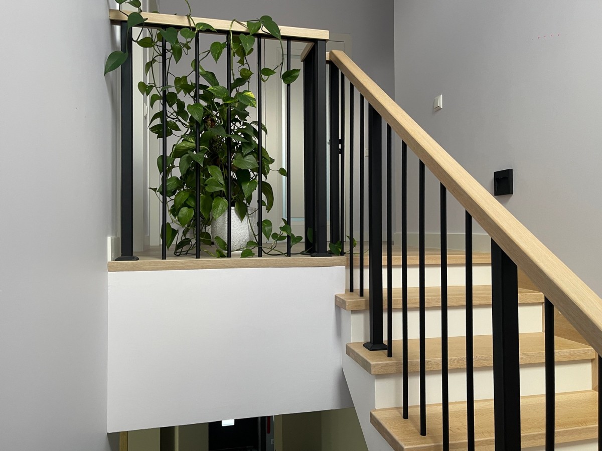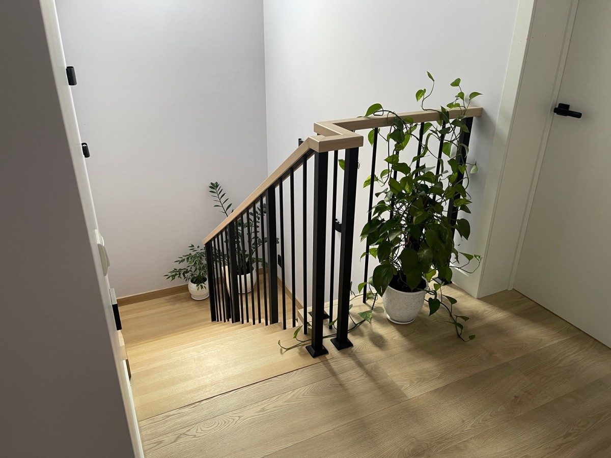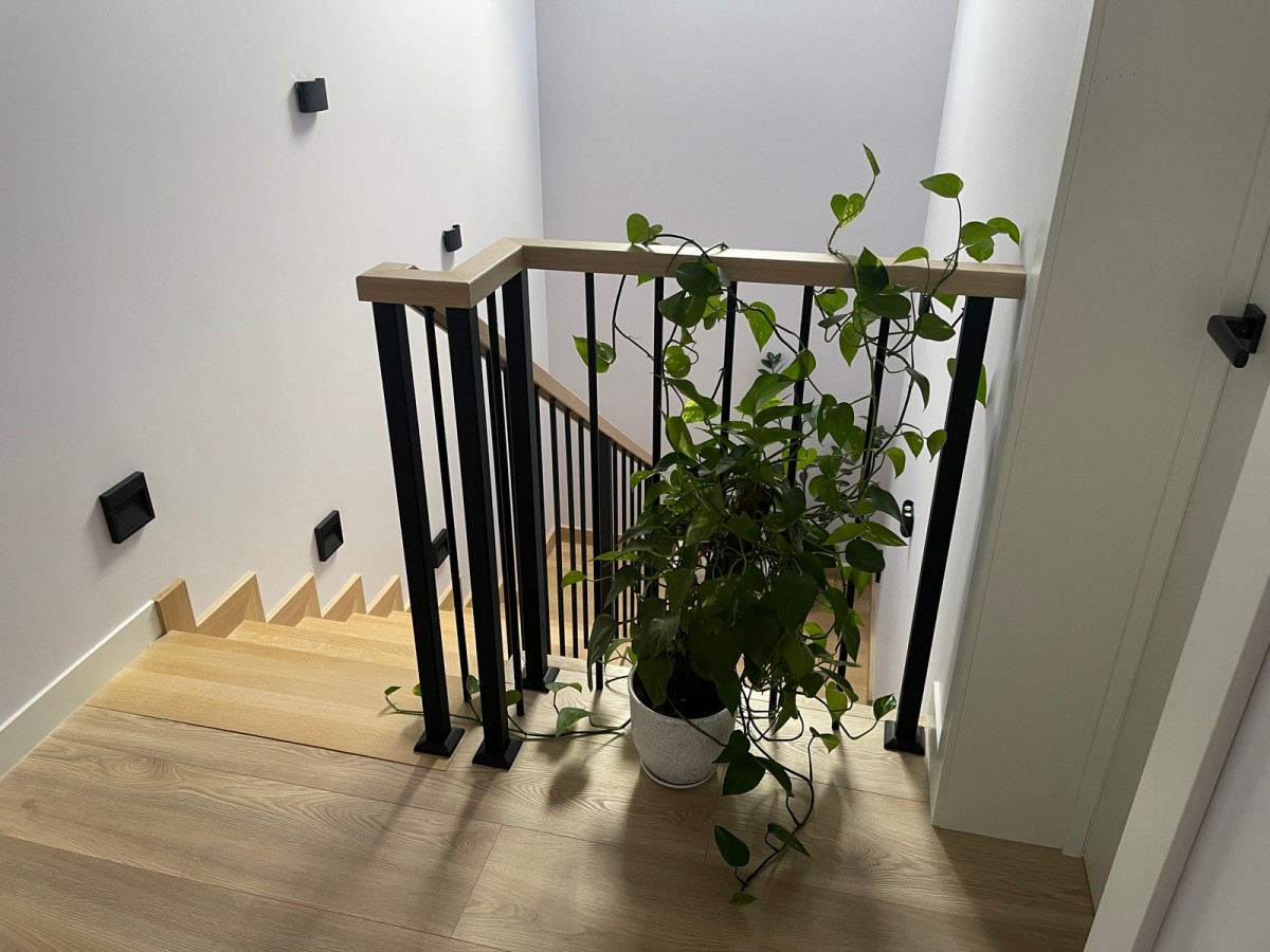 Получилось минималистичное и жёсткое лестничное ограждение: чёрный металл задаёт графику, дубовый поручень визуально связывает конструкцию с напольным покрытием и добавляет тактильного тепла. Ограждение обеспечивает безопасный подъём и гармонично вписывается в современный светлый интерьер дома.