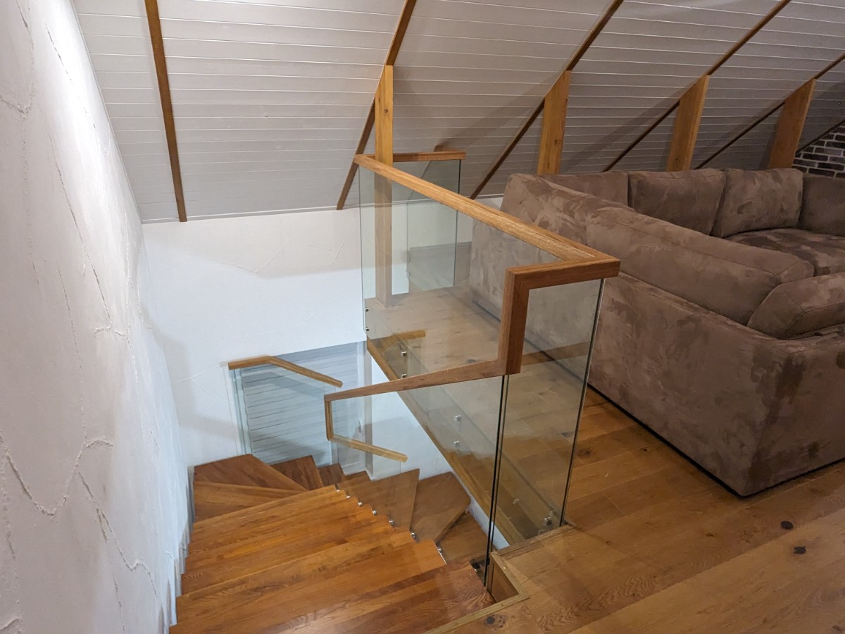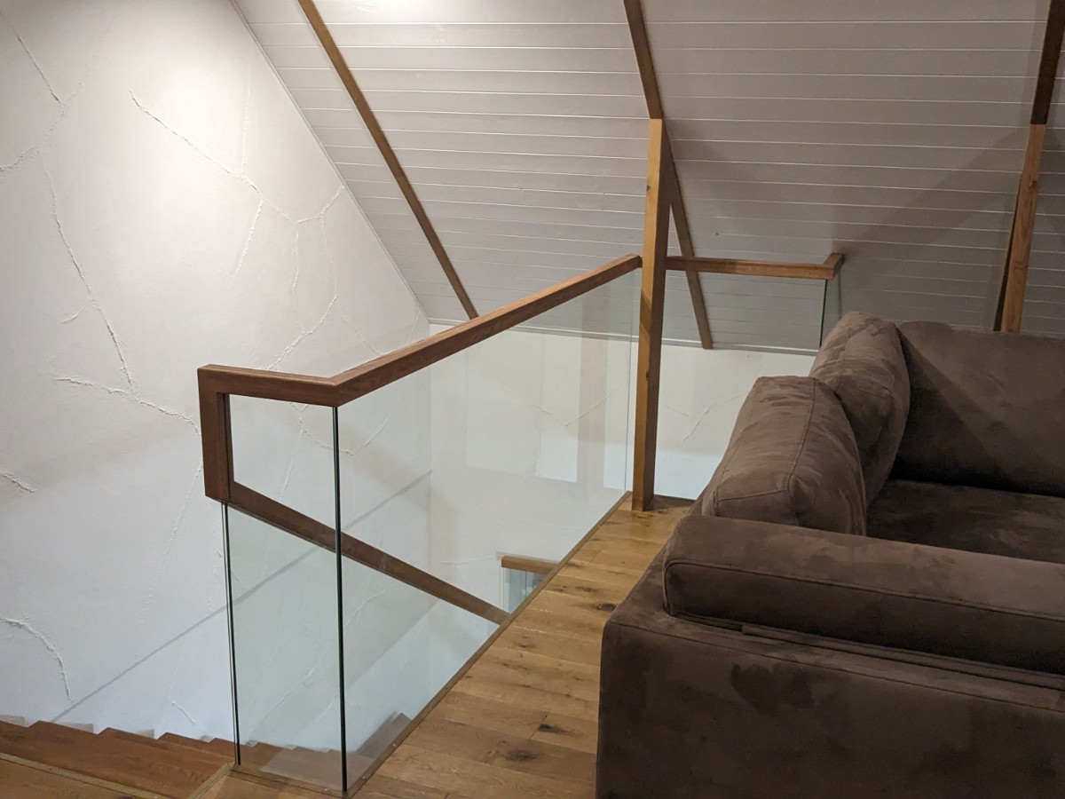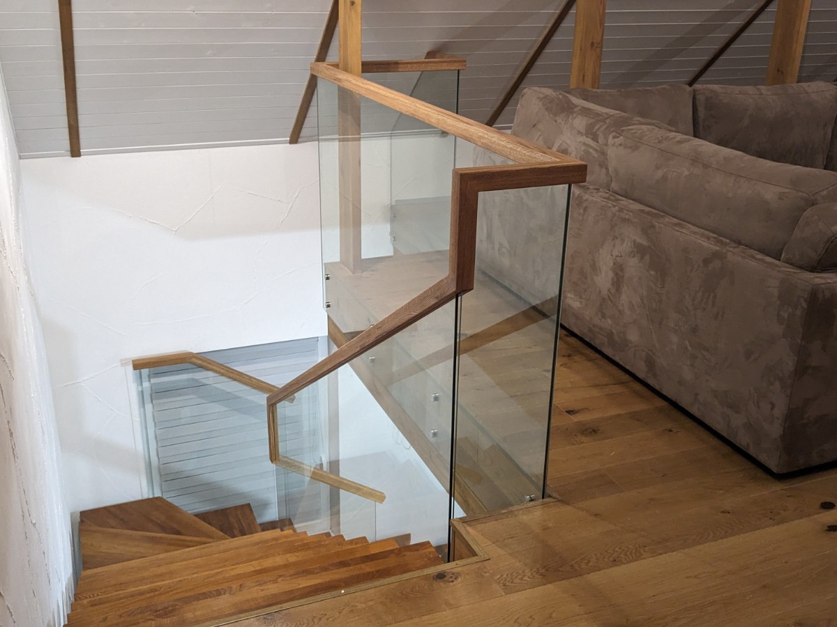 Даже при полностью стеклянном заполнении поручень остаётся важным — это и тактильная опора, и финальная линия дизайна. В базовой комплектации мы используем поручни из шлифованной, не тонированной сосны сорта АБ; при необходимости можно выбрать другие решения, чтобы поручень совпадал по цвету и характеру с отделкой дома.