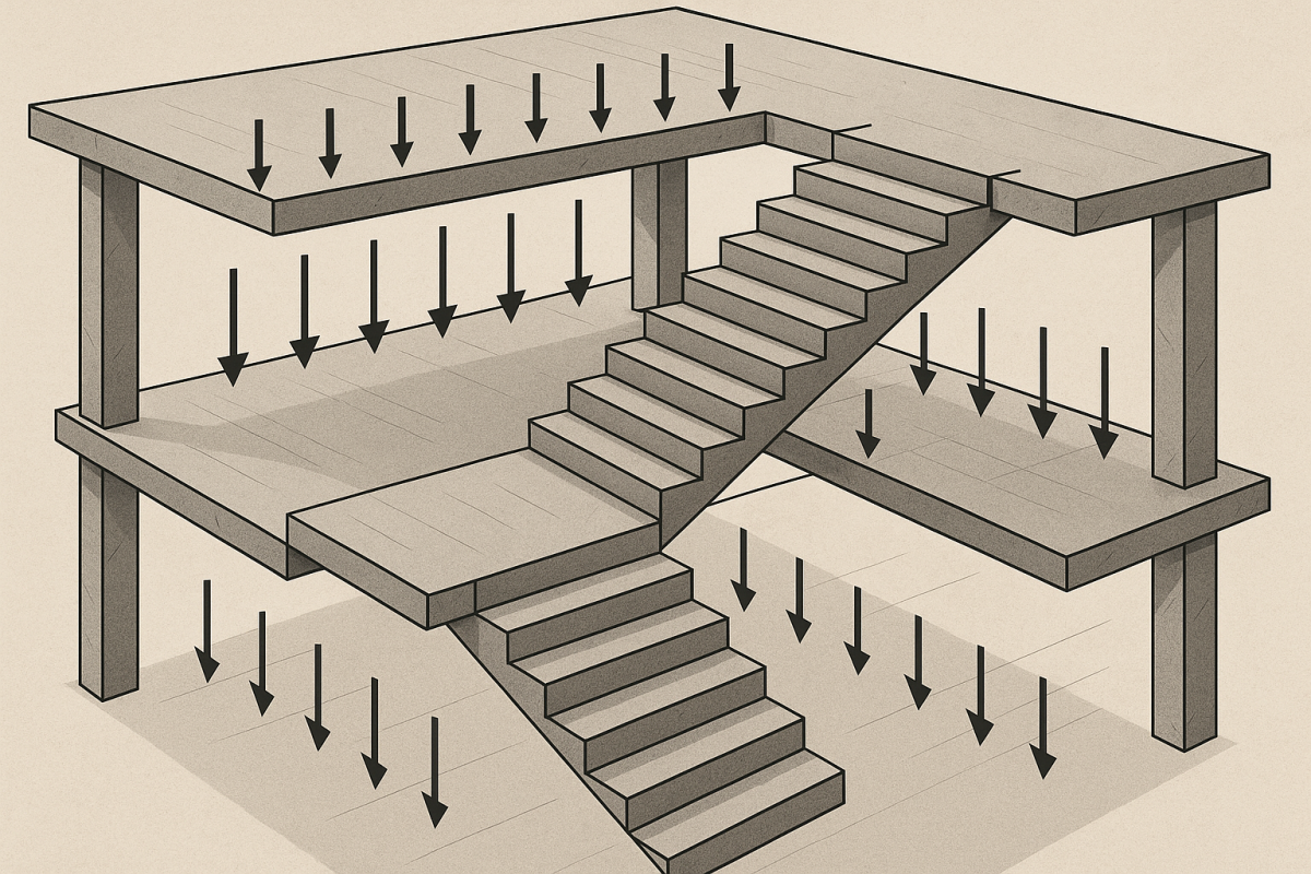 Расчёт нагрузки на межэтажную лестницу всегда включает суммарный эффект этих факторов: сначала определяют нагрузку на марши и площадки, затем — как она передаётся на перекрытия, стены и фундамент.