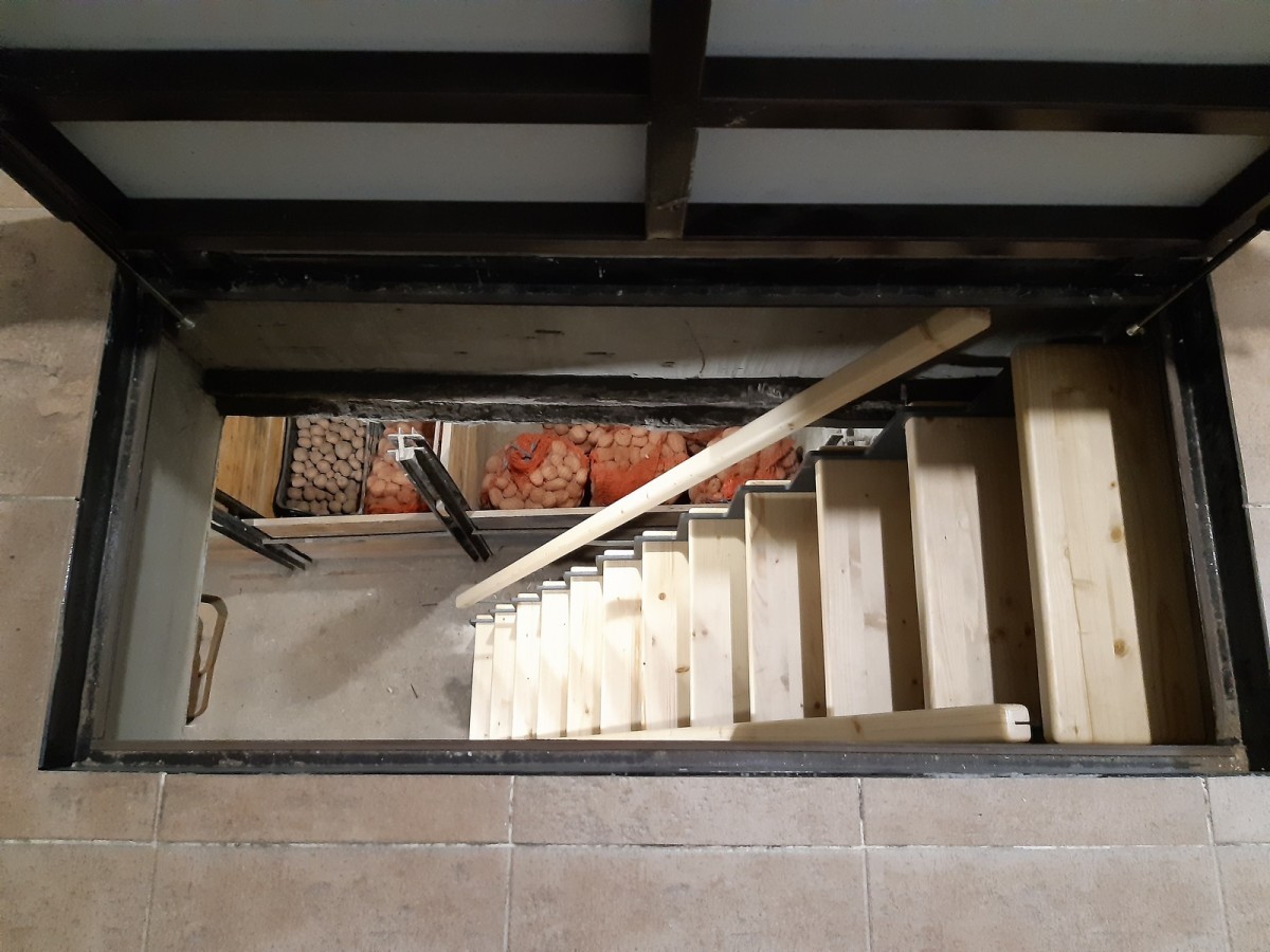 Если подвал глубокий и обширный, устанавливают стационарные лестницы. Винтовая модель занимает мало места, но не очень комфортна при спуске/подъеме, по ней сложно переносить тяжелые, объемные предметы.