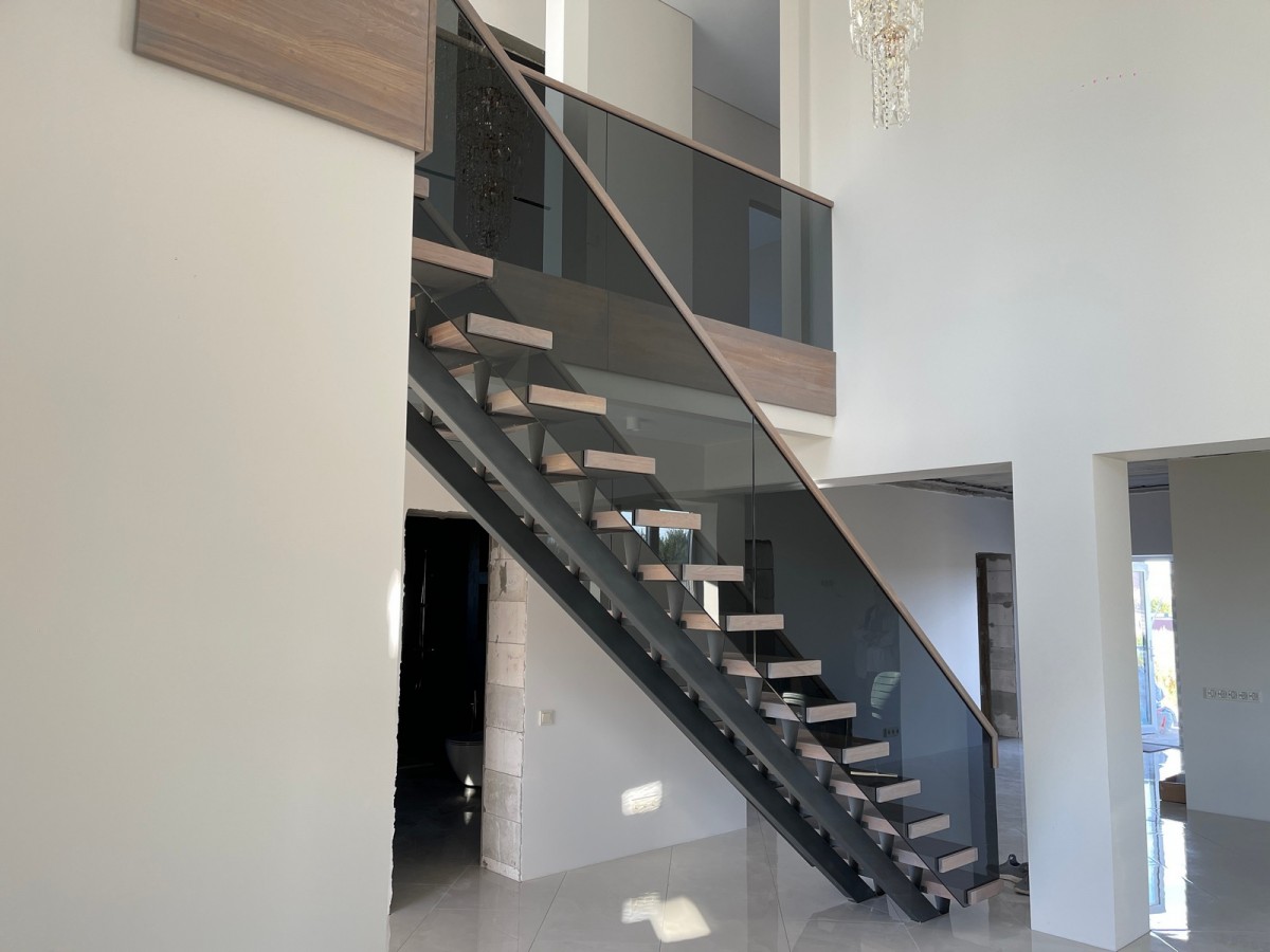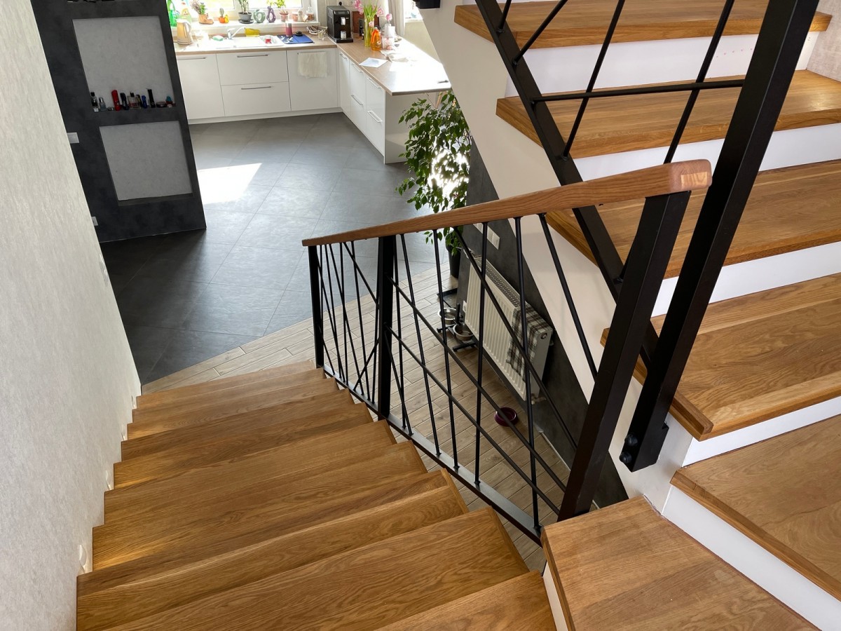 - Если потолки невысокие, избыток тёмных плоскостей (тёмный пол + тёмная лестница + тёмные ограждения) создаёт ощущение давящего объёма.